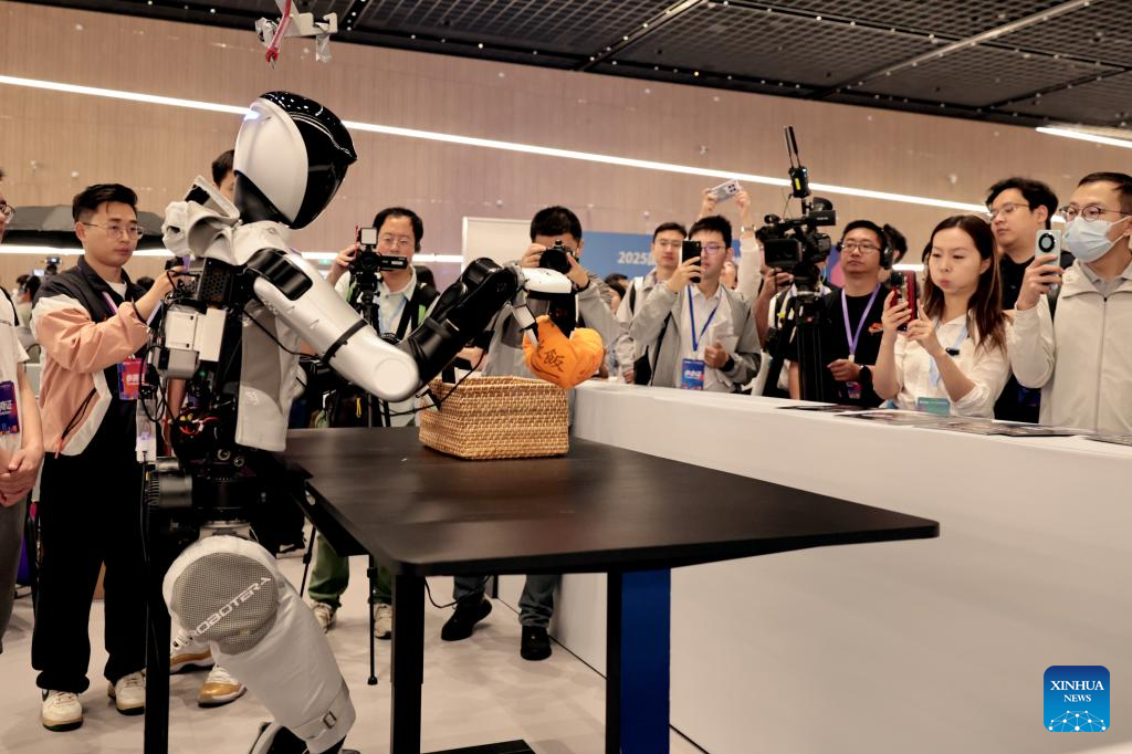 Visitantes toman fotografías de un robot compitiendo en un concurso de organización de artículos diversos durante la Competencia Internacional de Habilidades de Robots Humanoides 2025 celebrada en el Salón de Ciencias de Zhangjiang, en Shanghai, en el este de China, el 29 de mayo de 2025. La Competencia Internacional de Habilidades de Robots Humanoides 2025 se inauguró el jueves en Shanghai, centrándose en escenarios industriales, domésticos y comerciales. Más de 60 equipos de todo el mundo compitieron en aplicaciones robóticas e innovación tecnológica clave. (Xinhua/Fang Zhe)