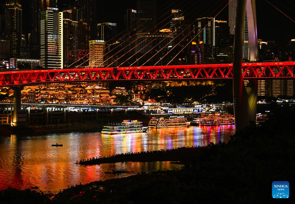 Imagen del 28 de mayo de 2025 de la vista nocturna del área escénica de Hongyadong, en Chongqing, en el suroeste de China. Hongyadong en Chongqing es una antigua puerta de la ciudad que se ha transformado en un gigantesco edificio suspendido que alberga restaurantes y otros lugares de entretenimiento. (Xinhua/Wang Quanchao)