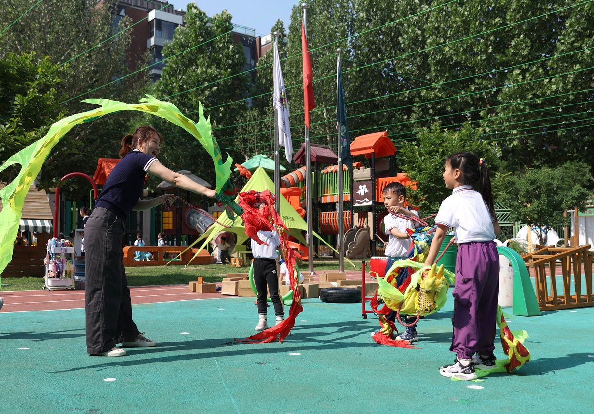 Para dar la bienvenida al próximo Festival del Bote del Dragón y al Día del Niño, los niños experimentan la danza del dragón bajo la guía de una maestra en una guardería en el distrito de Haidian, Beijing, el 28 de mayo de 2025. (Zou Hong/chinadaily.com.cn.)
