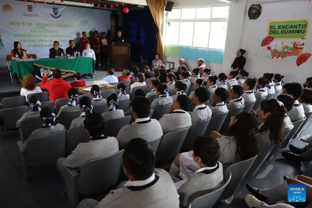Imagen del 28 de mayo de 2025 del director del Centro Cultural de China en México, Shi Yuewen (d-atrás-podio), hablando durante un evento para celebrar el Festival del Bote del Dragón, en la Escuela Secundaria "Leyes de Reforma", en Nezahualcóyotl, México. (Xinhua/Daniel Augusto)