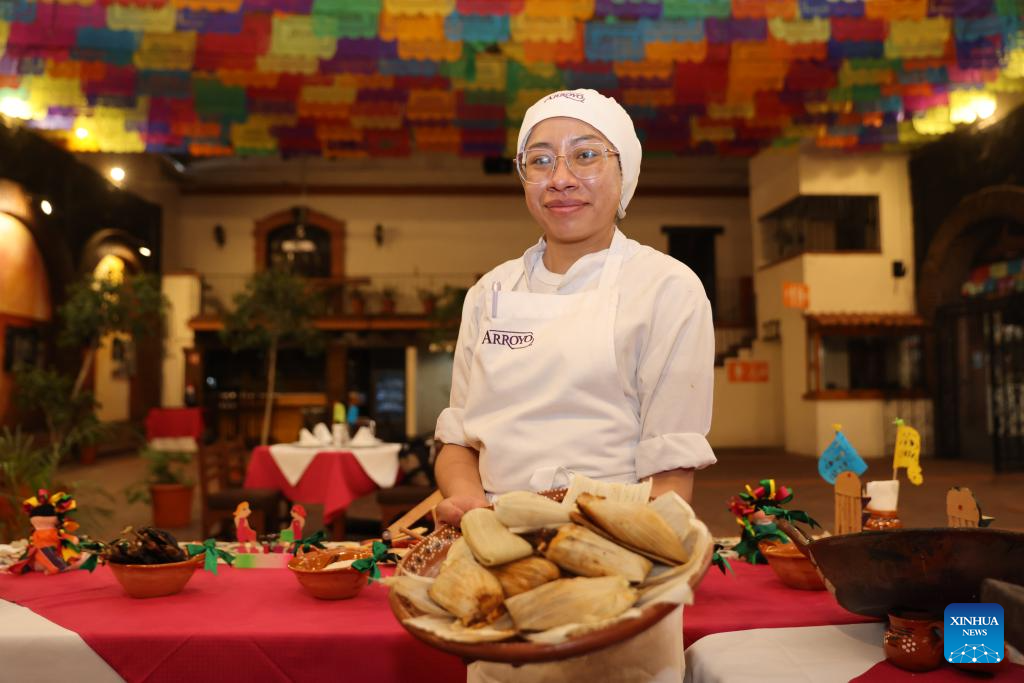 Imagen del 28 de mayo de 2025 de una chef mostrando tamales en un restaurante, en la Ciudad de México, capital de México. Los tamales, un platillo tradicional mexicano con forma similar al zongzi chino, se elaboran con masa de maíz molida rellena de carne y especias, envuelta y cocida al vapor en hojas de maíz o de plátano. (Xinhua/Li Mengxin)