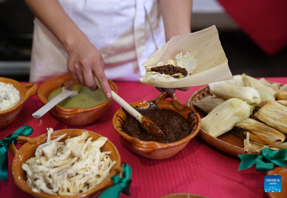 Imagen del 28 de mayo de 2025 de un chef elaborando tamales en un restaurante, en la Ciudad de México, capital de México. Los tamales, un platillo tradicional mexicano con forma similar al zongzi chino, se elaboran con masa de maíz molida rellena de carne y especias, envuelta y cocida al vapor en hojas de maíz o de plátano. (Xinhua/Li Mengxin)