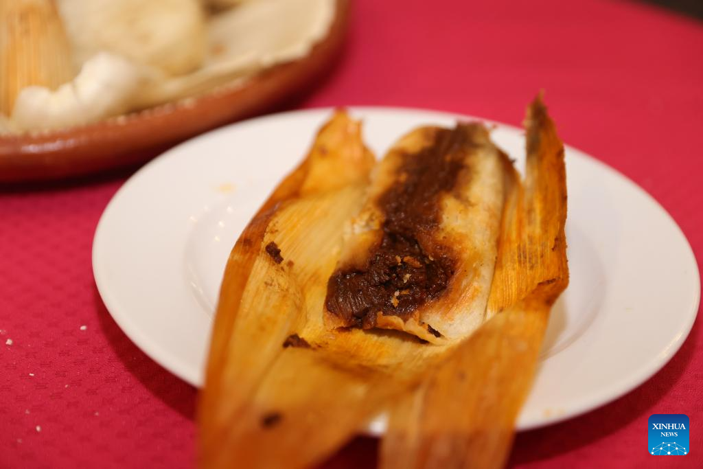 Imagen del 28 de mayo de 2025 de un tamal en un restaurante, en la Ciudad de México, capital de México. Los tamales, un platillo tradicional mexicano con forma similar al zongzi chino, se elaboran con masa de maíz molida rellena de carne y especias, envuelta y cocida al vapor en hojas de maíz o de plátano. (Xinhua/Li Mengxin)
