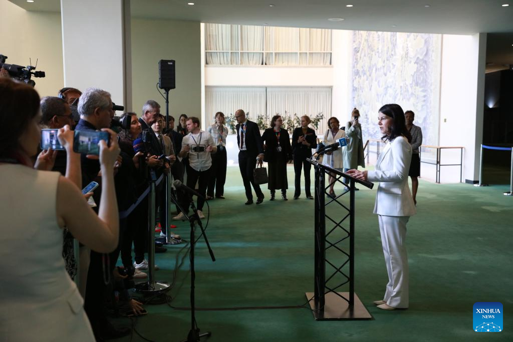 Annalena Baerbock, habla con la prensa después de ser elegida como presidenta de la próxima 80ª sesión de la Asamblea General de la Organización de las Naciones Unidas (ONU), en la sede de la ONU, en Nueva York, el 2 de junio de 2025. La exministra de Relaciones Exteriores de Alemania, Annalena Baerbock, fue elegida el lunes como presidenta de la próxima 80ª sesión de la Asamblea General de la ONU. (Xinhua/Xie E)