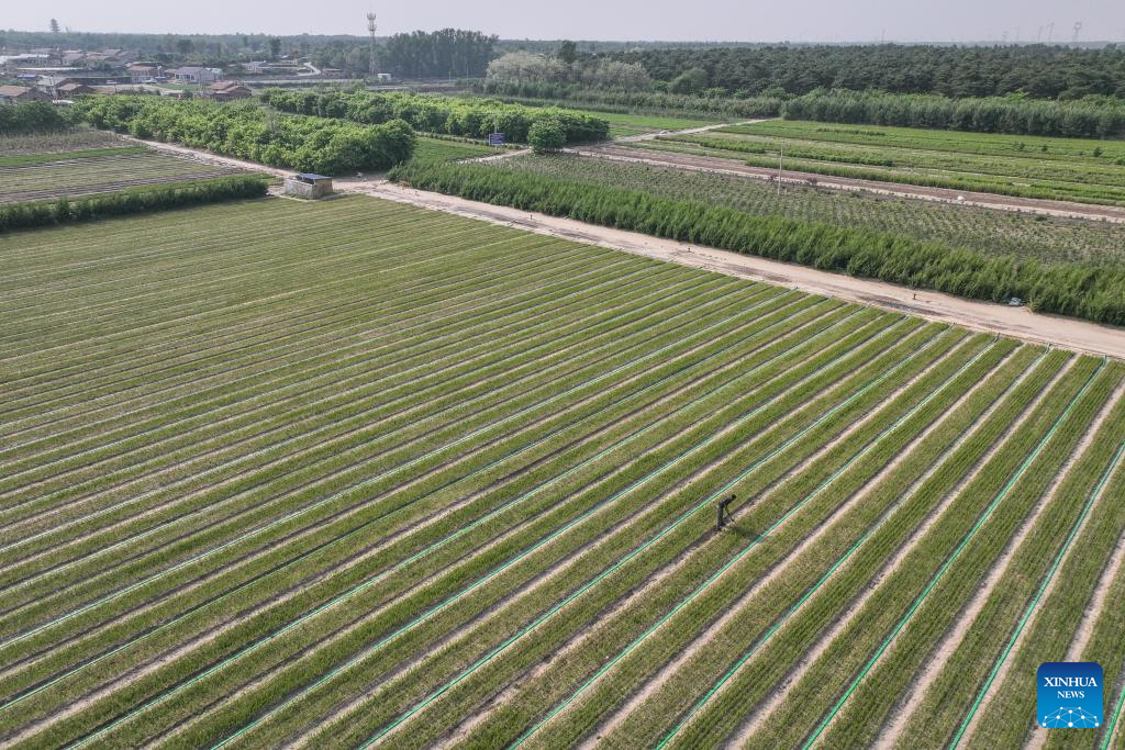 Vista aérea tomada con un dron el 29 de mayo de 2025 de una base de cultivo de plántulas del Instituto de Investigación de Control y Utilización de Arena de Liaoning, en el distrito de Zhangwu de Fuxin, en la provincia de Liaoning, en el noreste de China. Localizado en el extremo sur del arenal de Horqin, el distrito de Zhangwu solía estar plagado de tormentas de arena y polvo. Desde hace más de 70 años, sus habitantes no han cesado en su empeño de transformar el entorno ecológico de esta zona para ganar la dura batalla contra la desertificación. (Xinhua/Pan Yulong)