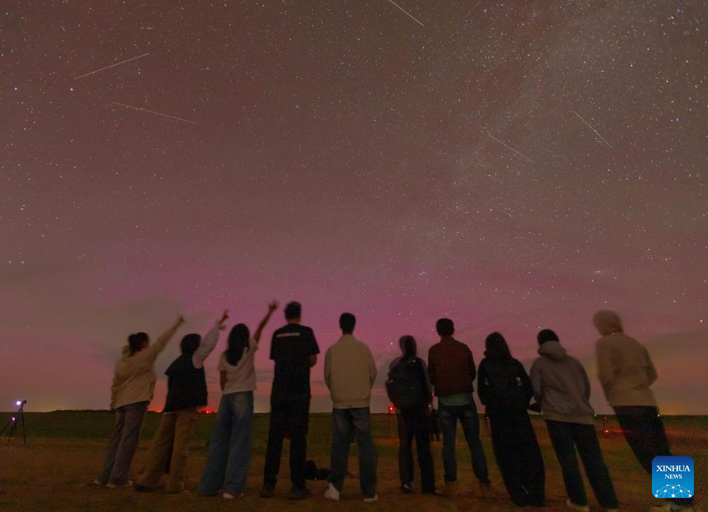 Aficionados a la fotografía posan para una foto de grupo bajo la aurora en el distrito de Huachuan de la ciudad de Jiamusi, provincia nororiental china de Heilongjiang, el 1 de junio de 2025. (Fotografía de Zhu Zongqiang/Xinhua.)