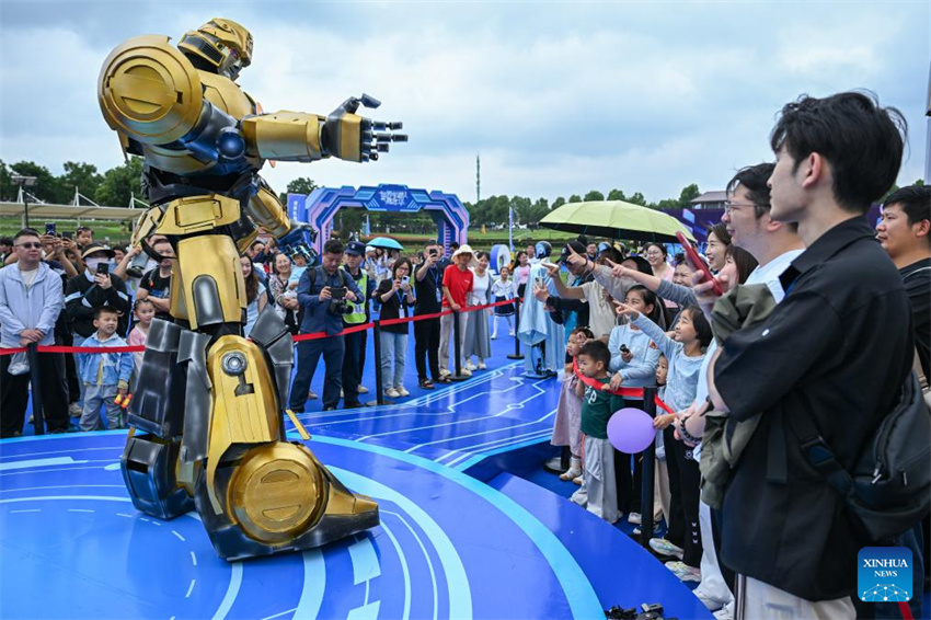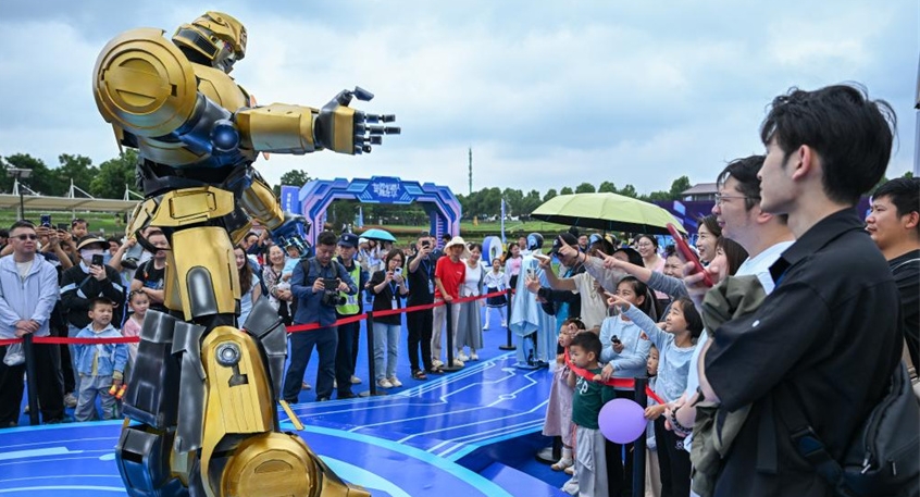 Visitantes interactúan con un robot durante el carnaval mundial de robots en Wuhan, provincia central china de Hubei, el 2 de junio de 2025. El evento comenzó en dicha ciudad el lunes, con la presentación de casi 100 robots, incluidos robots mascota, robots maquilladores, bandas de robótica, etc. Los asistentes interactuaron con los robots para experimentar el encanto de la vida potenciada por la tecnología. (Xinhua/Du Zixuan.)