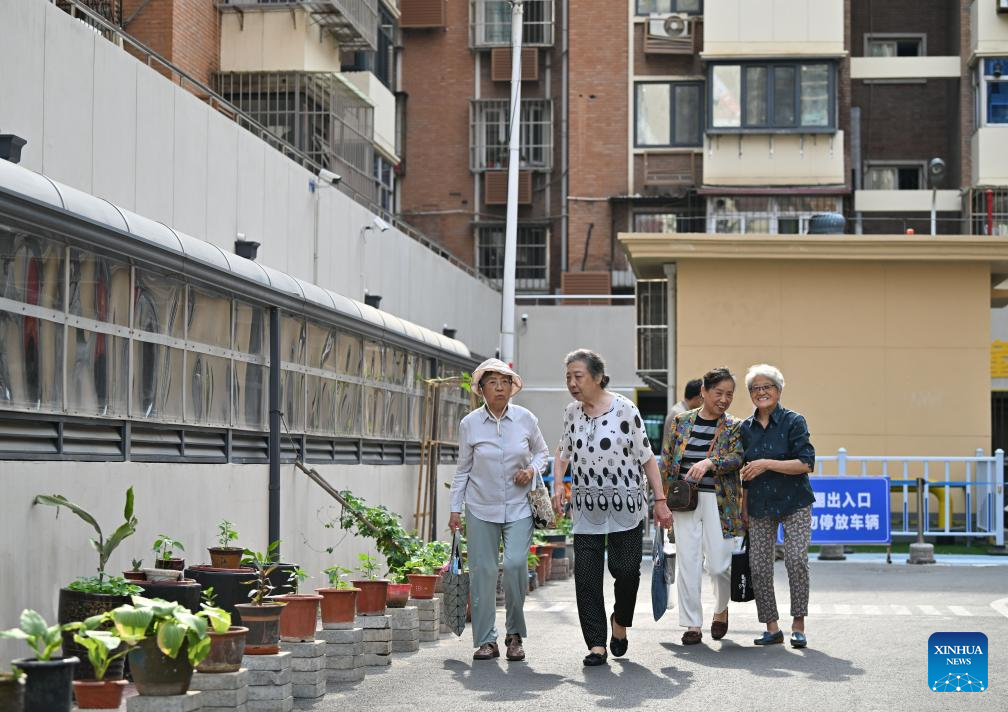 Residentes caminan en un barrio renovado en el distrito comercial de la calle Nanmenwai, en Tianjin, norte de China, el 29 de mayo de 2025. (Xinhua/Sun Fanyue.)