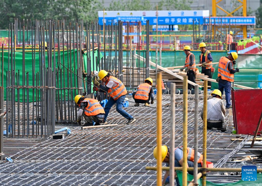 Constructores trabajan en la obra de construcción de un proyecto de renovación urbana en el distrito comercial de la calle Nanmenwai, en Tianjin, norte de China, el 29 de mayo de 2025. (Xinhua/Sun Fanyue.)