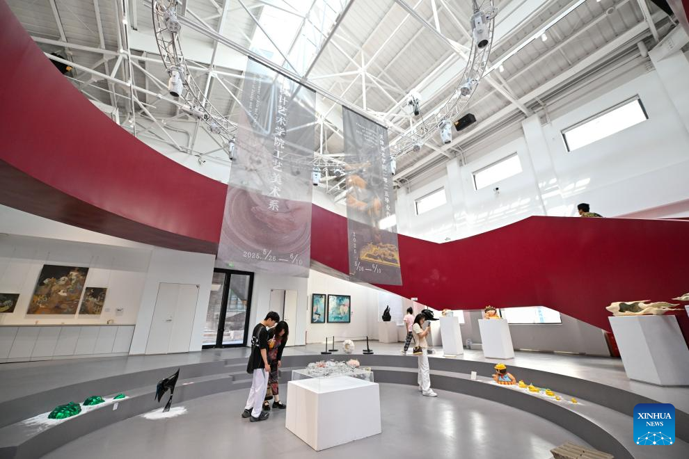 Un grupo de personas visita una zona de exposiciones renovada en la Academia de Bellas Artes de Tianjin, en el norte de China, el 2 de junio de 2025. (Xinhua/Sun Fanyue.)