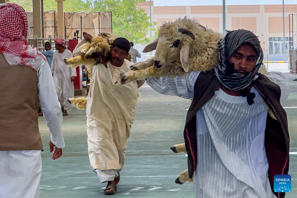 Vendedores llevan ovejas en un mercado de ganado antes del Eid al-Adha o Fiesta del Sacrificio, en Doha, Catar, el 3 de junio de 2025. (Foto de Nikku/Xinhua.)