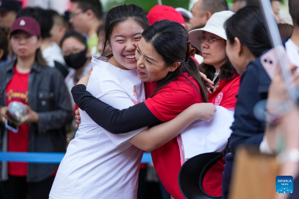 Una estudiante abraza a su profesora antes de entrar en un sitio del examen nacional de ingreso a la universidad, en Harbin, en la provincia de Heilongjiang, en el noreste de China, el 7 de junio de 2025. El examen nacional de ingreso a la universidad de este año, también conocido como gaokao, comenzó el sábado en todo el país. Un total de 13,35 millones de estudiantes chinos se presentarán al examen de este año. (Xinhua/Wang Jianwei)