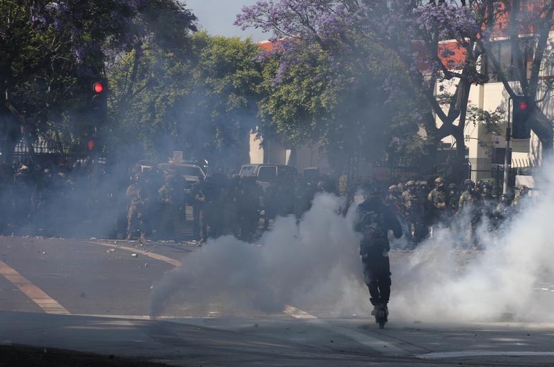 Imagen del 7 de junio de 2025 de agentes federales disparando gases lacrimógenos a los manifestantes, en Paramount, en el condado de Los Angeles, California, Estados Unidos. (Xinhua/Qiu Chen)