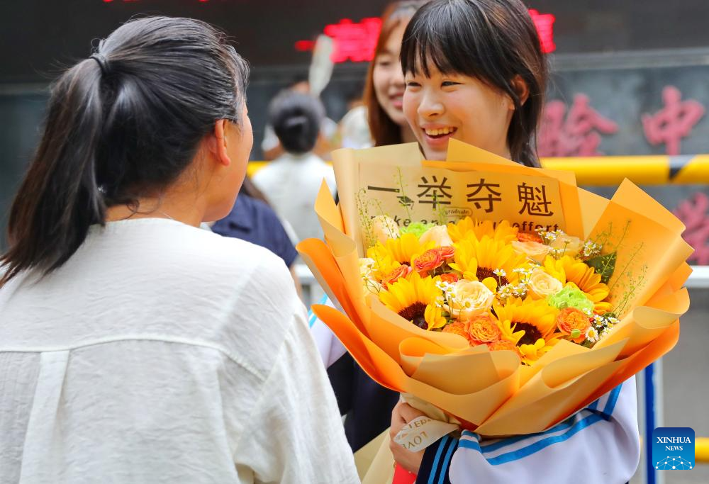 Una estudiante recibe flores después del examen en un sitio del examen nacional de ingreso a la universidad, en la ciudad de Qinhuangdao, en la provincia de Hebei, en el norte de China, el 9 de junio de 2025. El examen nacional de ingreso a la universidad de este año, también conocido como gaokao, comenzó el 7 de junio de este año. En algunas regiones, el examen finalizó el lunes. (Xinhua/Cao Jianxiong)
