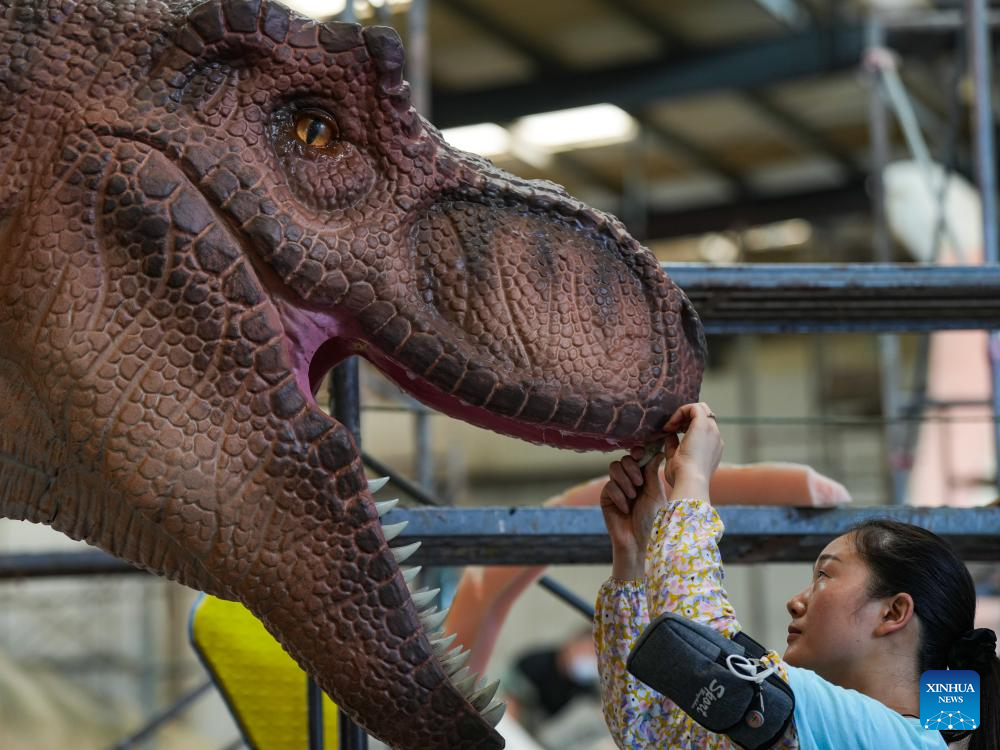 Imagen del 4 de junio de 2025 de una trabajadora instalando dientes en un dinosaurio animatrónico en una fábrica, en Zigong, en la provincia de Sichuan, en el suroeste de China. Zigong, una ciudad en la provincia de Sichuan famosa por su artesanía centenaria de fabricación de linternas y sus ricos depósitos de fósiles de dinosaurios, ostenta los títulos de "Ciudad natal de los dinosaurios" y "Ciudad de las linternas". (Xinhua/Wang Xi)