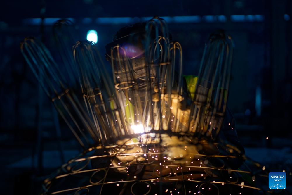 Imagen del 4 de junio de 2025 de un trabajador soldando el marco de una linterna en una fábrica, en Zigong, en la provincia de Sichuan, en el suroeste de China. Zigong, una ciudad en la provincia de Sichuan famosa por su artesanía centenaria de fabricación de linternas y sus ricos depósitos de fósiles de dinosaurios, ostenta los títulos de "Ciudad natal de los dinosaurios" y "Ciudad de las linternas". (Xinhua/Zhang Xiaoyu)