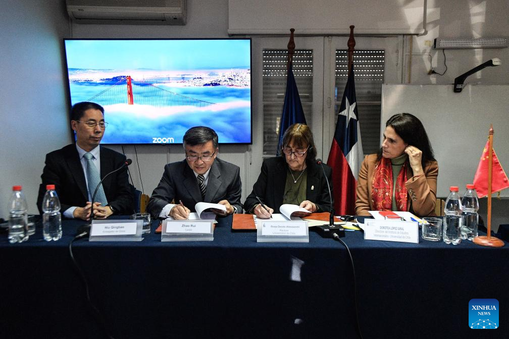 (De izq. a der.) El embajador de China en Chile, Niu Qingbao, el vicepresidente de la Academia China de Ciencias Sociales (CASS, por sus siglas en inglés), Zhao Rui, la rectora de la Universidad de Chile, Rosa Devés, y la directora del Instituto de Estudios Internacionales de la Universidad de Chile, Dorotea López, participan en la firma de un acuerdo entre Universidad de Chile y la CASS para establecer el Centro de Estudios Chinos en las instalaciones del Instituto de Estudios Internacionales de la Universidad de Chile, en Santiago, capital de Chile, el 9 de junio de 2025. La Universidad de Chile y la CASS firmaron el lunes un acuerdo para la creación del Centro de Estudios Chinos, con el propósito de fortalecer el intercambio académico y estudiantil. (Xinhua/Jorge Villegas)