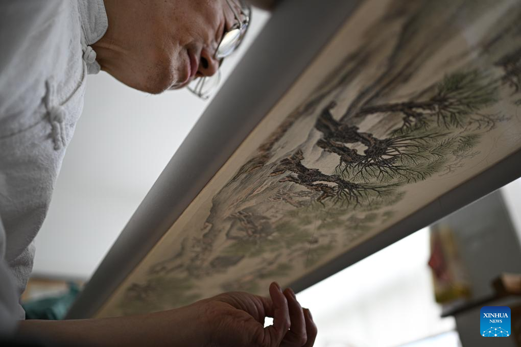 Imagen del 6 de junio de 2025 de Chen Boyu trabajando en una obra de arte de bordado de cabello en la fábrica de bordado de cabello de Jiali, en la ciudad de Dongtai, en Yancheng de la provincia de Jiangsu, en el este de China. El Bordado de Cabello de Dongtai, que se originó de la costumbre popular de utilizar cabellos humanos como hilo para bordar a Buda en la dinastía Tang (618-907) de China, tiene una historia de más de 1.300 años. (Xinhua/Xin Yuewei)