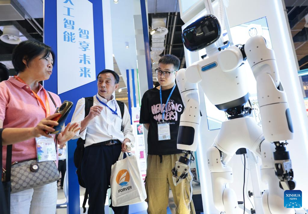 Visitantes conversan cerca de un robot humanoide exhibido durante la 11ª Feria Internacional de Tecnología de China (Shanghai) (CSITF, por sus siglas en inglés), en Shanghai, en el este de China, el 11 de junio de 2025. Alrededor de 1.000 expositores de casi 20 países y regiones mostraron aquí sus logros innovadores. (Xinhua/Fang Zhe)