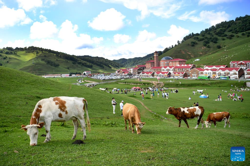 Esta foto tomada el 3 de agosto de 2024 muestra a unas personas visitando el paisaje de las praderas de Guanshan, en el distrito de Longxian de la ciudad de Baoji, provincia noroccidental china de Shaanxi. (Xinhua/Zou Jingyi.)