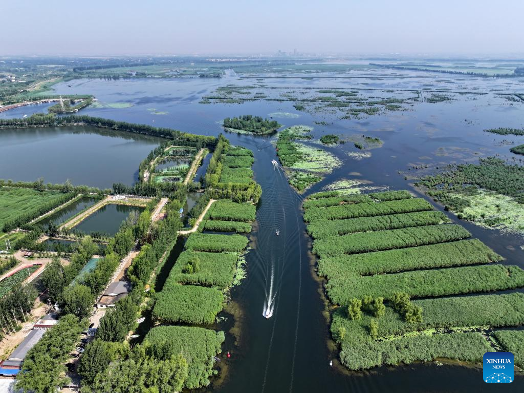 Una foto aérea tomada por un dron el 11 de junio de 2025 muestra barcos navegando en el lago Baiyangdian, en la Nueva Área de Xiongan, en la provincia septentrional china de Hebei. (Xinhua/Mu Yu.)