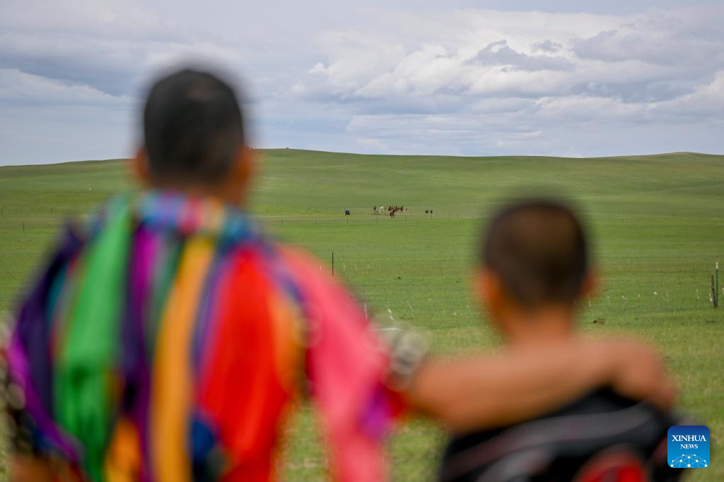 Urbuusan y su hijo Degjiin descansan después de practicar lucha mongola en un pasto en la Bandera Occidental de Ujimqin, Liga Xilingol, región autónoma de Mongolia Interior, en el norte de China, el 12 de junio de 2025. (Xinhua/Lian Zhen.)