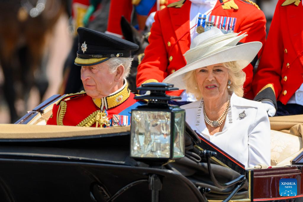 Imagen del 14 de junio de 2025 del rey británico, Carlos III, y la reina Camila, asistiendo al desfile Trooping the Colour, en honor al rey británico Carlos III en su cumpleaños oficial, en Londres, Reino Unido. (Xinhua/Ray Tang)