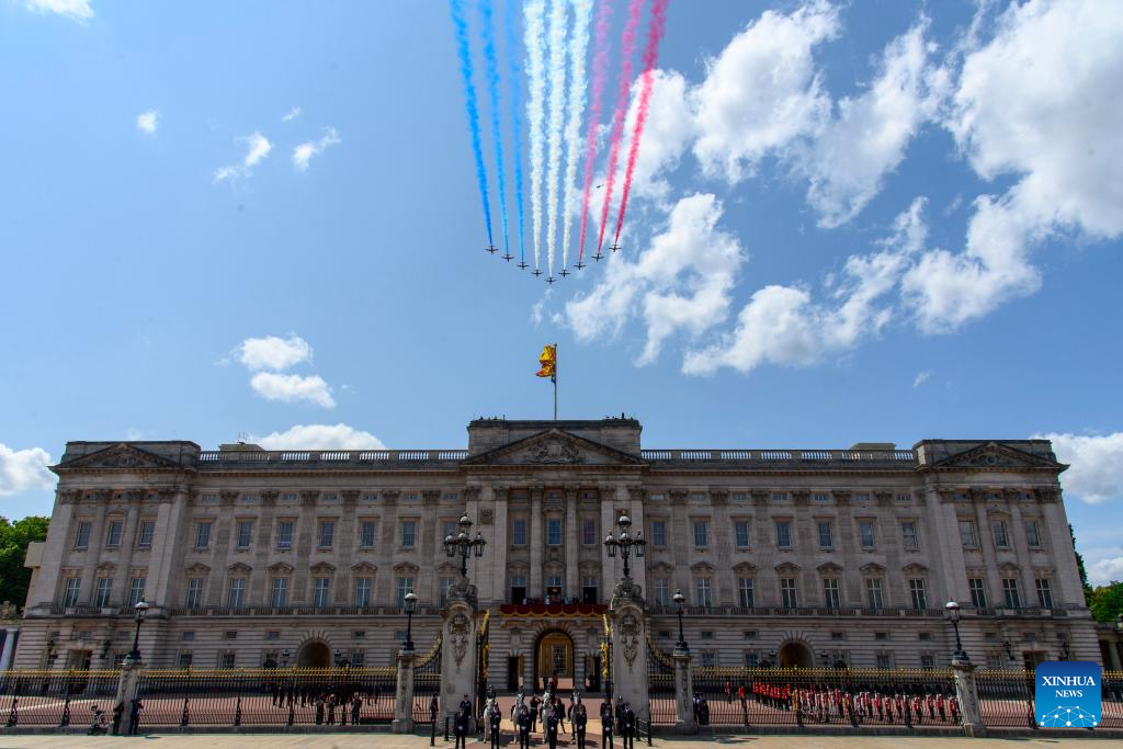 Imagen del 14 de junio de 2025 un sobrevuelo visto durante el desfile Trooping the Colour, en honor al rey británico Carlos III en su cumpleaños oficial, en Londres, Reino Unido. (Xinhua/Ray Tang)