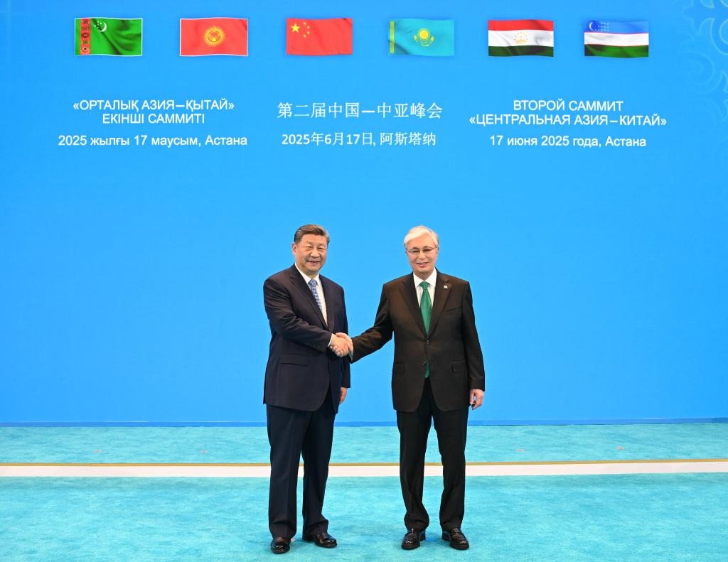 El presidente chino, Xi Jinping, estrecha la mano del presidente kazajo, Kassym-Jomart Tokayev, en Astaná, Kazajistán, el 17 de junio de 2025. La II Cumbre China-Asia Central se celebró el martes en Astaná. Tokayev presidió la cumbre. Xi, el presidente kirguís, Sadyr Japarov, el presidente tayiko, Emomali Rahmon, el presidente turkmeno, Serdar Berdimuhamedov, y el presidente uzbeko, Shavkat Mirziyoyev, asistieron a la cumbre. (Xinhua/Xie Huanchi)