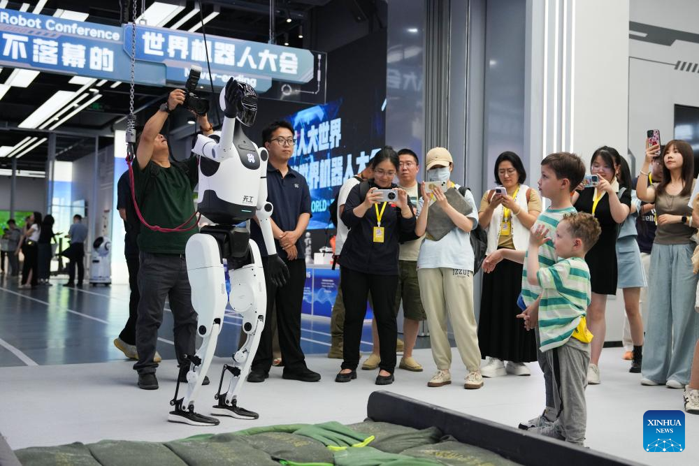 Un robot humanoide saluda a los visitantes en el Área de Desarrollo Económico y Tecnológico de Beijing, capital de China, el 17 de junio de 2025. (Xinhua/Zheng Huansong.)