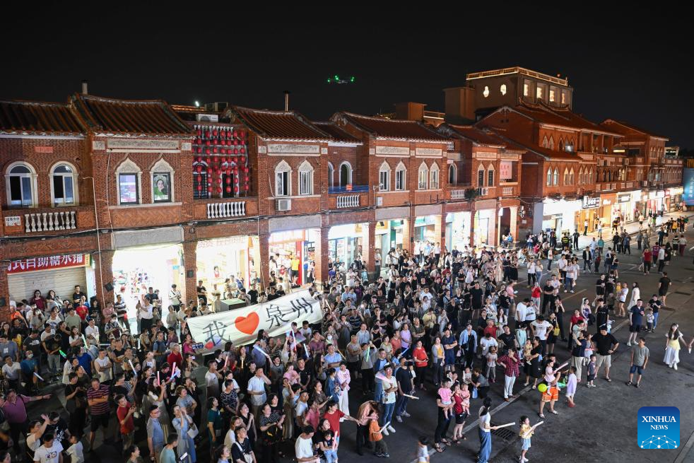 Turistas asisten a una representación en el centro histórico de Quanzhou, en la provincia china de Fujian, el 20 de mayo de 2025. Situada a lo largo de la costa de la provincia china de Fujian, Quanzhou fue uno de los mayores puertos del mundo a lo largo de la histórica Ruta Marítima de la Seda, especialmente durante las dinastías Song (960-1279) y Yuan (1271-1368). (Xinhua/Jiang Kehong.)