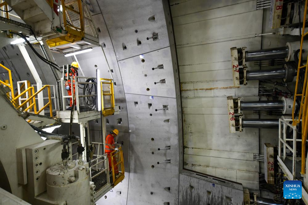 Obreros trabajan en la obra del túnel del río Amarillo en la carretera de Huanggang, en Jinan, provincia oriental china de Shandong, el 22 de junio de 2025. (Xinhua/Xu Suhui.)