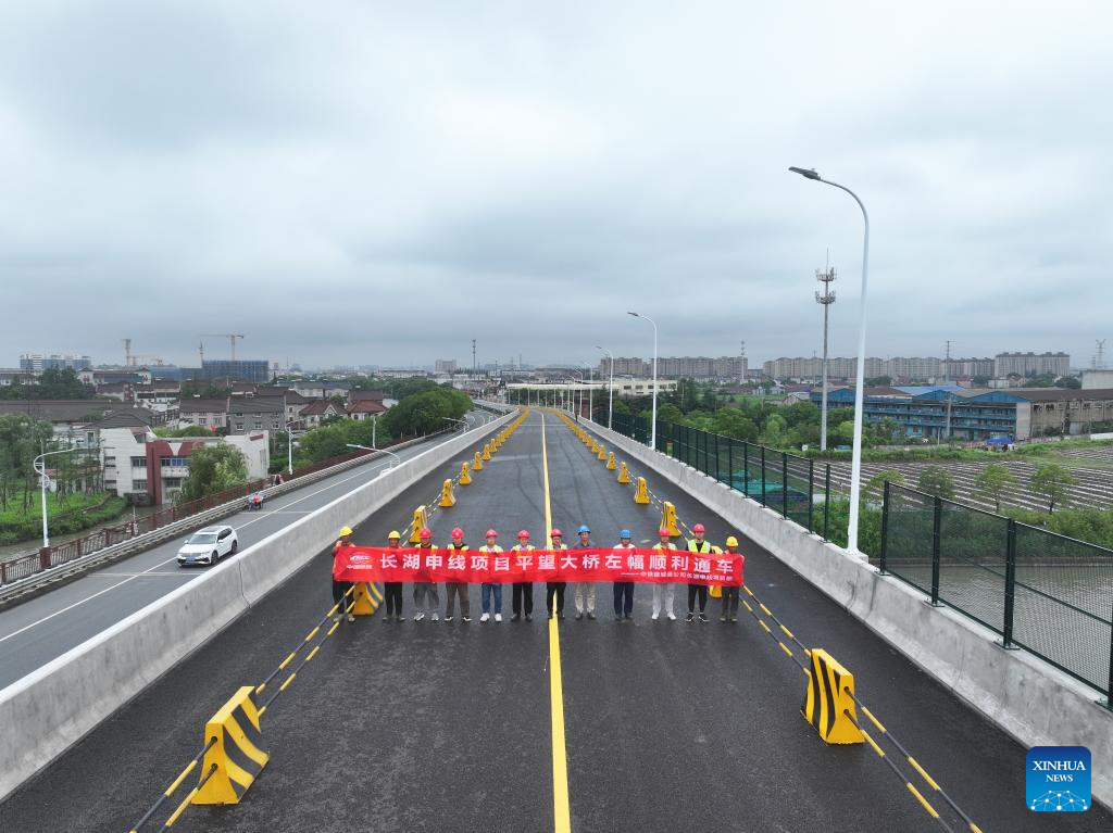 Una foto tomada con un dron muestra a trabajadores posando para las fotos con motivo de la apertura de los carriles izquierdos del recién construido puente Pingwang en el distrito de Wujiang de la ciudad de Suzhou, provincia de Jiangsu, en el este de China, el 23 de junio de 2025. (Xinhua/Ji Chunpeng.)