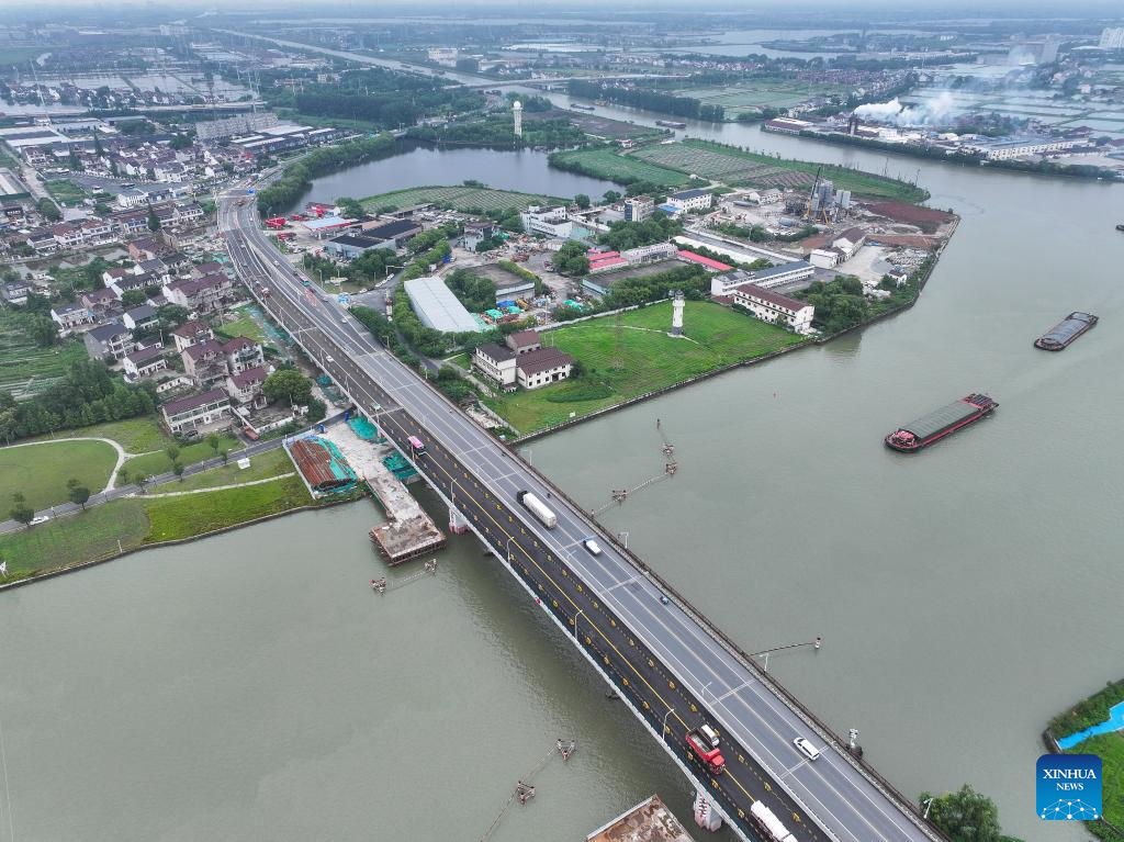 Una foto aérea tomada con un dron el 23 de junio de 2025 muestra una vista del puente Pingwang en el distrito de Wujiang de la ciudad de Suzhou, provincia oriental china de Jiangsu. (Xinhua/Ji Chunpeng.)