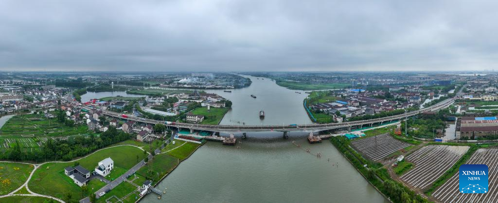 Una foto aérea tomada con un dron el 23 de junio de 2025 muestra una vista del puente Pingwang en el distrito de Wujiang de la ciudad de Suzhou, provincia oriental china de Jiangsu. (Xinhua/Ji Chunpeng.)