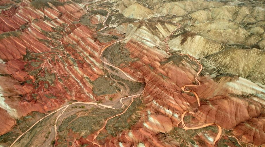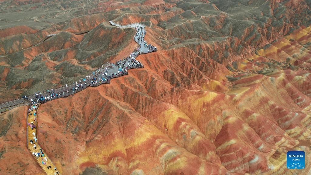 Una foto aérea tomada por un dron el 22 de junio de 2025 muestra a turistas disfrutando del paisaje del relieve de Danxia bajo la lluvia en el Parque Geológico Nacional de Danxia en Zhangye, provincia noroccidental china de Gansu. (Xinhua/Chen Bin.)