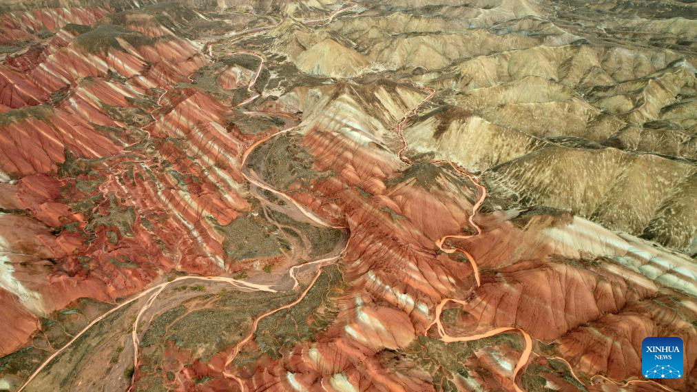 Una foto aérea tomada por un dron el 22 de junio de 2025 muestra una vista del relieve de Danxia bajo la lluvia en el Parque Geológico Nacional de Danxia en Zhangye, provincia noroccidental china de Gansu. (Xinhua/Chen Bin)