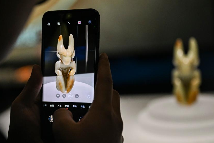 Un visitante toma fotos de una pieza expuesta durante un avance para los medios de comunicación de la exposición titulada "Leyendas de Dragón: la antigua civilización de la cultura Hongshan" en el Museo de Shanghai (sede del este), en la ciudad oriental china de Shanghai, el 25 de junio de 2025. (Foto de Chen Haoming/Xinhua.)