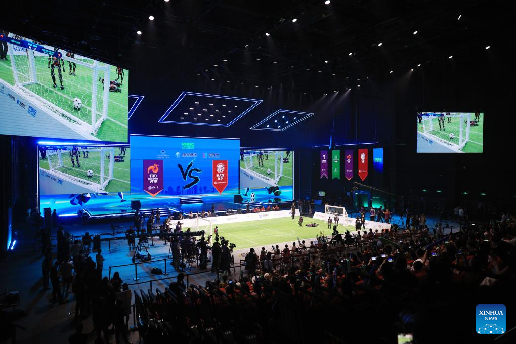 Imagen del 28 de junio de 2025 de una escena durante un partido de fútbol de robots impulsados por IA, en Beijing, capital de China. Un partido de fútbol robot 3 contra 3, en el que todos los jugadores eran autonómos mediante inteligencia artificial, concluyó aquí el sábado. Cuatro equipos de tres universidades chinas compitieron en el partido, y el campeón fue el equipo THU Robotics de la Universidad Tsinghua. (Xinhua/Zhang Chenlin)