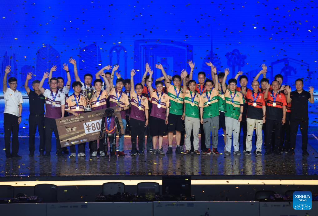 Imagen del 28 de junio de 2025 de miembros de los equipos participantes de la Universidad de Tsinghua, la Universidad Agrícola de China y la Universidad de Ciencias de la Información y Tecnologías de Beijing posando para una fotografía de grupo durante la ceremonia de entrega de premios de un partido de fútbol de robots impulsados por IA, en Beijing, capital de China. Un partido de fútbol robot 3 contra 3, en el que todos los jugadores eran autonómos mediante inteligencia artificial, concluyó aquí el sábado. Cuatro equipos de tres universidades chinas compitieron en el partido, y el campeón fue el equipo THU Robotics de la Universidad Tsinghua. (Xinhua/Zhang Chenlin)