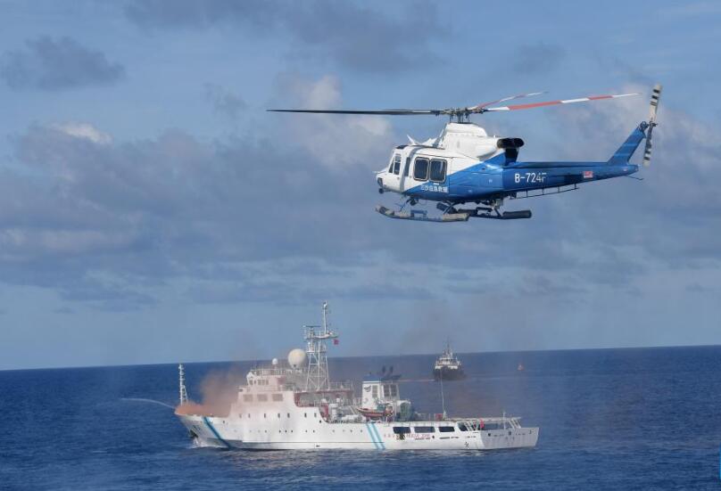 El 26 de junio de 2025, en la ciudad de Sansha, en aguas cercanas a la isla Yongxing de las islas Xisha, en la provincia china de Hainan, se llevó a cabo un simulacro completo de salvamento marítimo de emergencia. En el simulacro participaron 15 embarcaciones, 2 helicópteros de rescate y más de 200 miembros del personal de rescate. (Xinhua/Zhao Yingquan.)