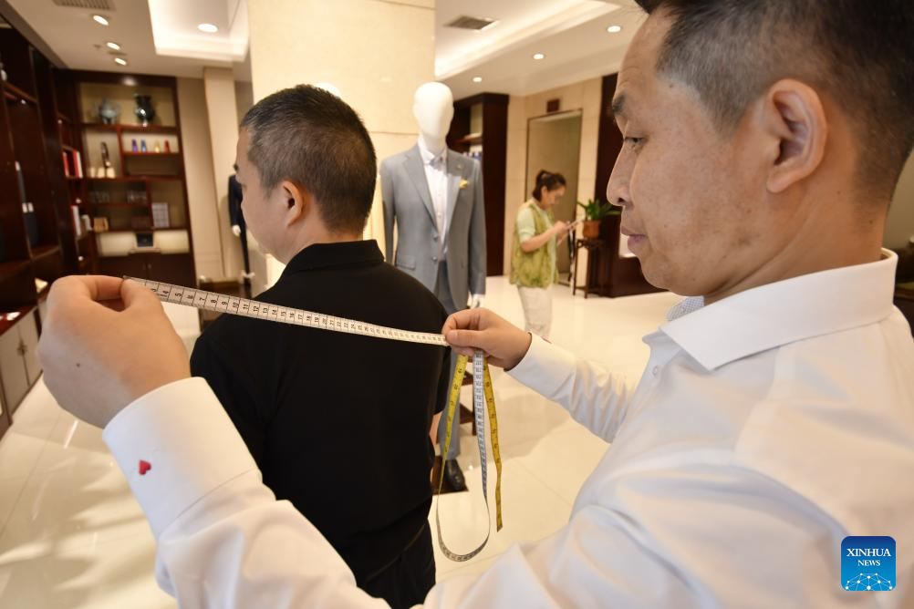 Li Wei toma las medidas corporales de un cliente en la tienda insignia de Longqingxiang en Beijing, capital de China, 10 de junio de 2025. (Xinhua/Li Xin.)