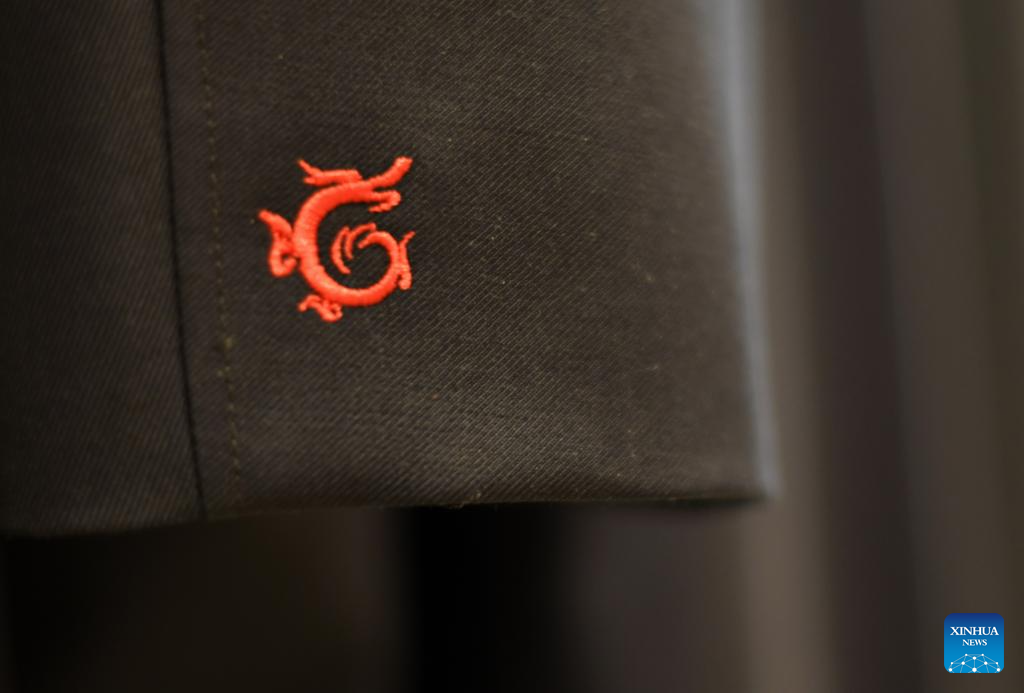 Esta foto tomada el 24 de junio de 2025 muestra un patrón bordado en un conjunto de ropa de estilo occidental personalizada expuesta en la tienda insignia de Longqingxiang en Beijing, capital de China. (Xinhua/Li Xin.)