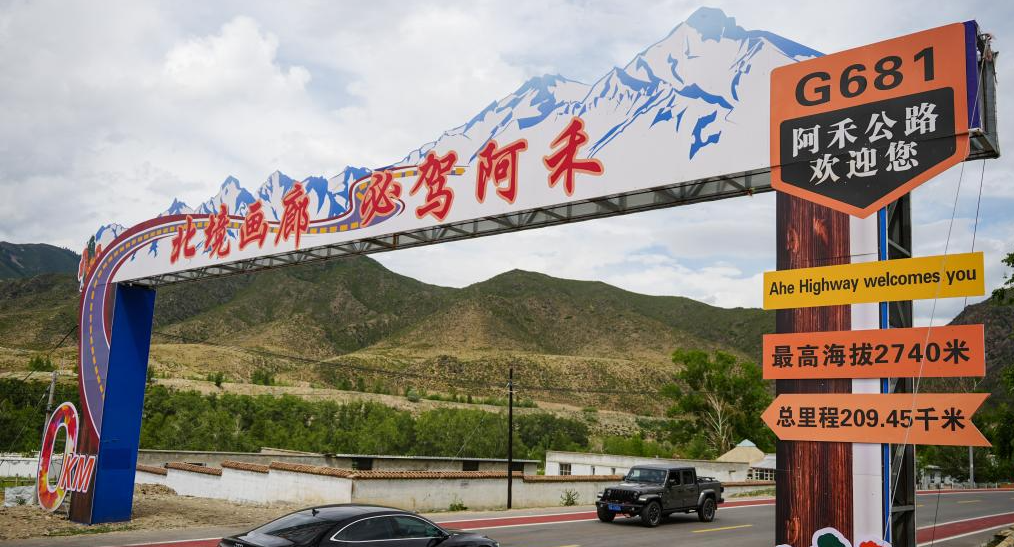 Varias personas posan para una foto junto a la autopista Altay-Hemu en la región autónoma uygur de Xinjiang, en el noroeste de China, el 30 de junio de 2025. La autopista de 209,45 kilómetros de longitud que une la ciudad de Altay y la aldea de Hemu se inauguró oficialmente el lunes, conectando varios destinos turísticos. (Xinhua/Xu Hongyan.)