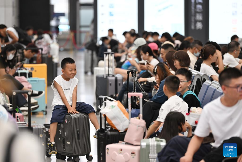 Pasajeros esperan por trenes en la Estación del Ferrocarril del Oeste de Tianjin, en la municipalidad de Tianjin, en el norte de China, el 1 de julio de 2025. Un nuevo horario de trenes entró en vigor en China el 1 de julio de 2025, comenzando la temporada de viajes de verano de 62 días de este año, de acuerdo con el operador ferroviario. (Xinhua/Li Ran)