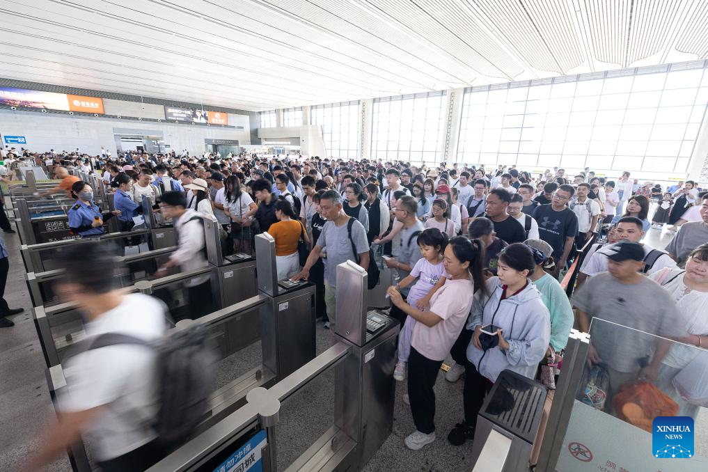 Pasajeros se registran en la Estación del Ferrocarril de Huzhou, en la ciudad de Huzhou, en la provincia de Zhejiang, en el este de China, el 1 de julio de 2025. Un nuevo horario de trenes entró en vigor en China el 1 de julio de 2025, comenzando la temporada de viajes de verano de 62 días de este año, de acuerdo con el operador ferroviario. (Xinhua/Yi Fan)