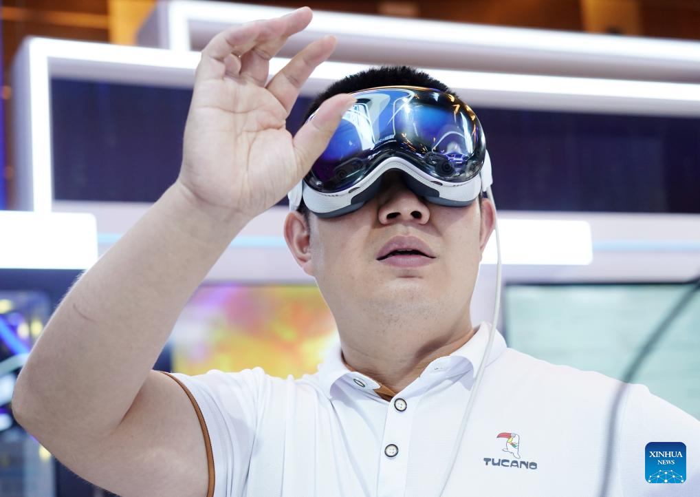 Un visitante prueba un dispositivo de realidad mixta en un área de exposición de la Conferencia Global de Economía Digital 2025, en Beijing, capital de China, el 2 de julio de 2025. Con el tema de "Construyendo una ciudad digitalmente amigable", la Conferencia Global de Economía Digital 2025 se inauguró aquí el miércoles. (Xinhua/Zhang Chenlin)