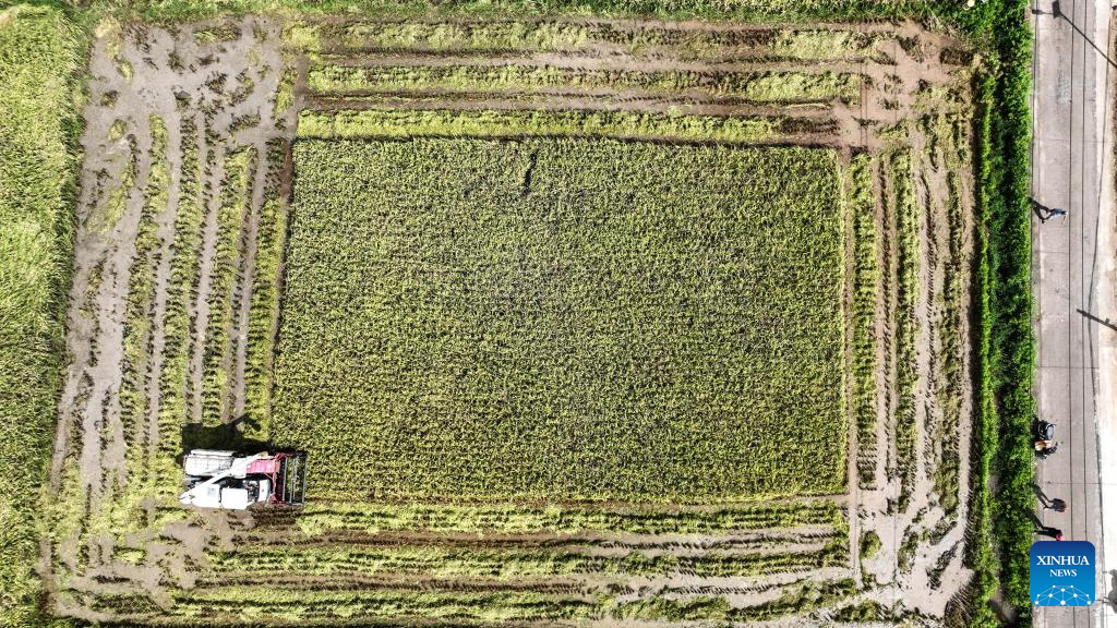 Vista aérea del 2 de julio de 2025 de una cosechadora recolectando arroz, en la aldea de Banping, en el poblado de Kangxiling de la ciudad de Qinzhou, en la región autónoma de la etnia zhuang de Guangxi, en sur de China. La cosecha temprana de arroz está en pleno apogeo aquí. (Xinhua/Zhang Ailin)