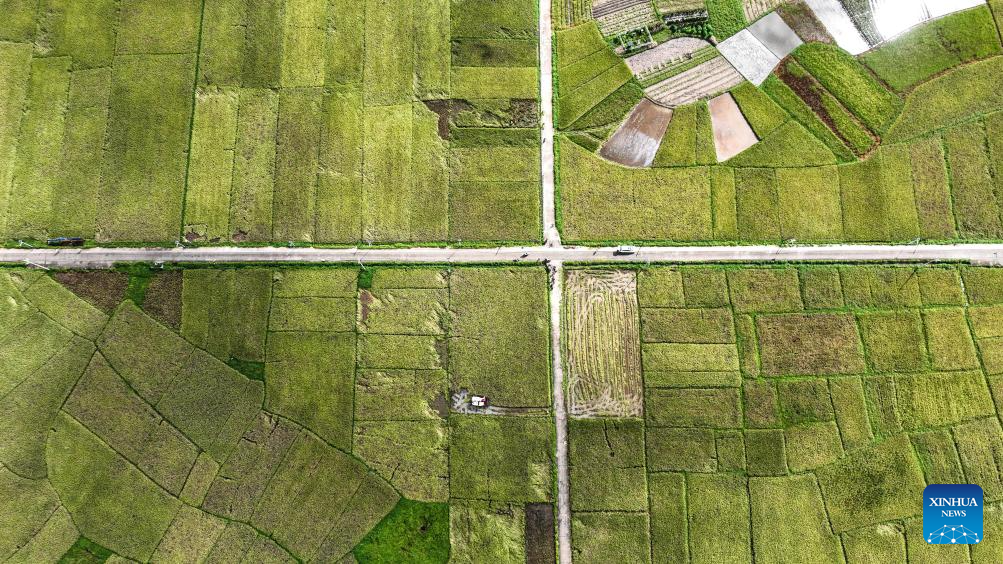 Vista aérea del 2 de julio de 2025 de los campos de arroz, en el poblado de Kangxiling de la ciudad de Qinzhou, en la región autónoma de la etnia zhuang de Guangxi, en sur de China. La cosecha temprana de arroz está en pleno apogeo aquí. (Xinhua/Zhang Ailin)