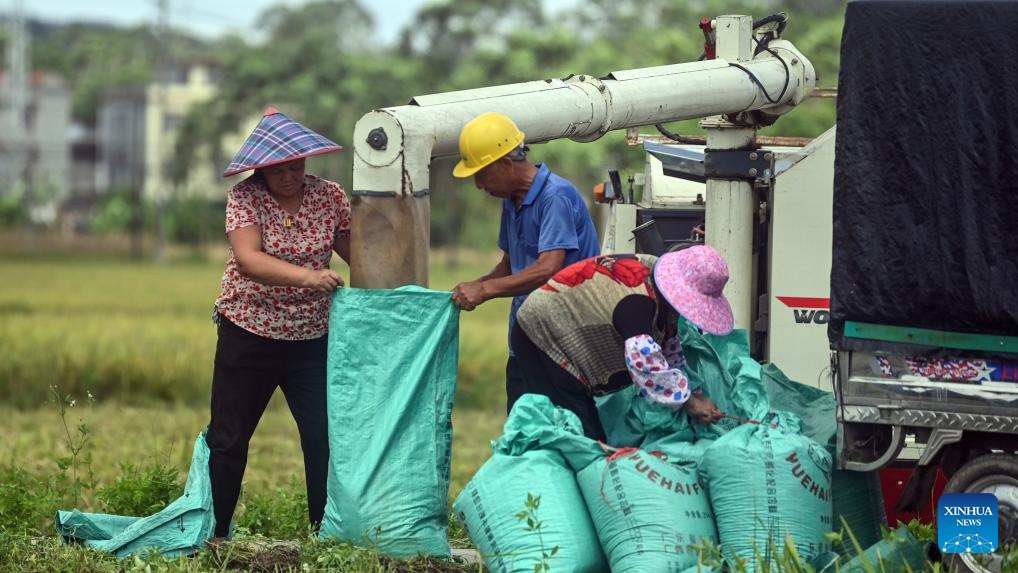 Agricultores empacan arroz cosechado, en la aldea de Banping, en el poblado de Kangxiling de la ciudad de Qinzhou, en la región autónoma de la etnia zhuang de Guangxi, en sur de China, el 2 de julio de 2025. La cosecha temprana de arroz está en pleno apogeo aquí. (Xinhua/Zhang Ailin)